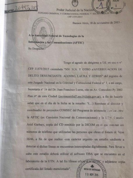 "Fui perito oficial designando por ambos jueces junto con otros ingenieros de la UTN y lo corroboramos, por supuesto que Patricia Bullruich mandó a su gente de cibercrimen para decir que todo eso no servÃa. En 2016 se hicieron nuevas pericias, por el segundo juez que tomo la causa, que es MartÃnez de Giorgi y se volvieron a verificar que efectivamente estaban intervenidos los teléfonos, pero ya habÃa asumido el gobierno de Macri", agregó.