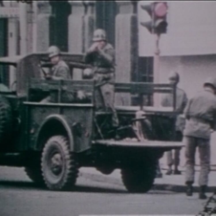 La secuencia es corta, en blanco y negro. La cámara toma a un numeroso grupo de personas corriendo en dirección contraria al objetivo del camarógrafo. Muchos de saco y corbata, se nota que huyen de un peligro inminente; alguno hasta se atreve a saludar con su mano cuando advierte el lente que toma la escena. Luego que pasó ese grupo, aparece un camión militar, colmado de soldados.